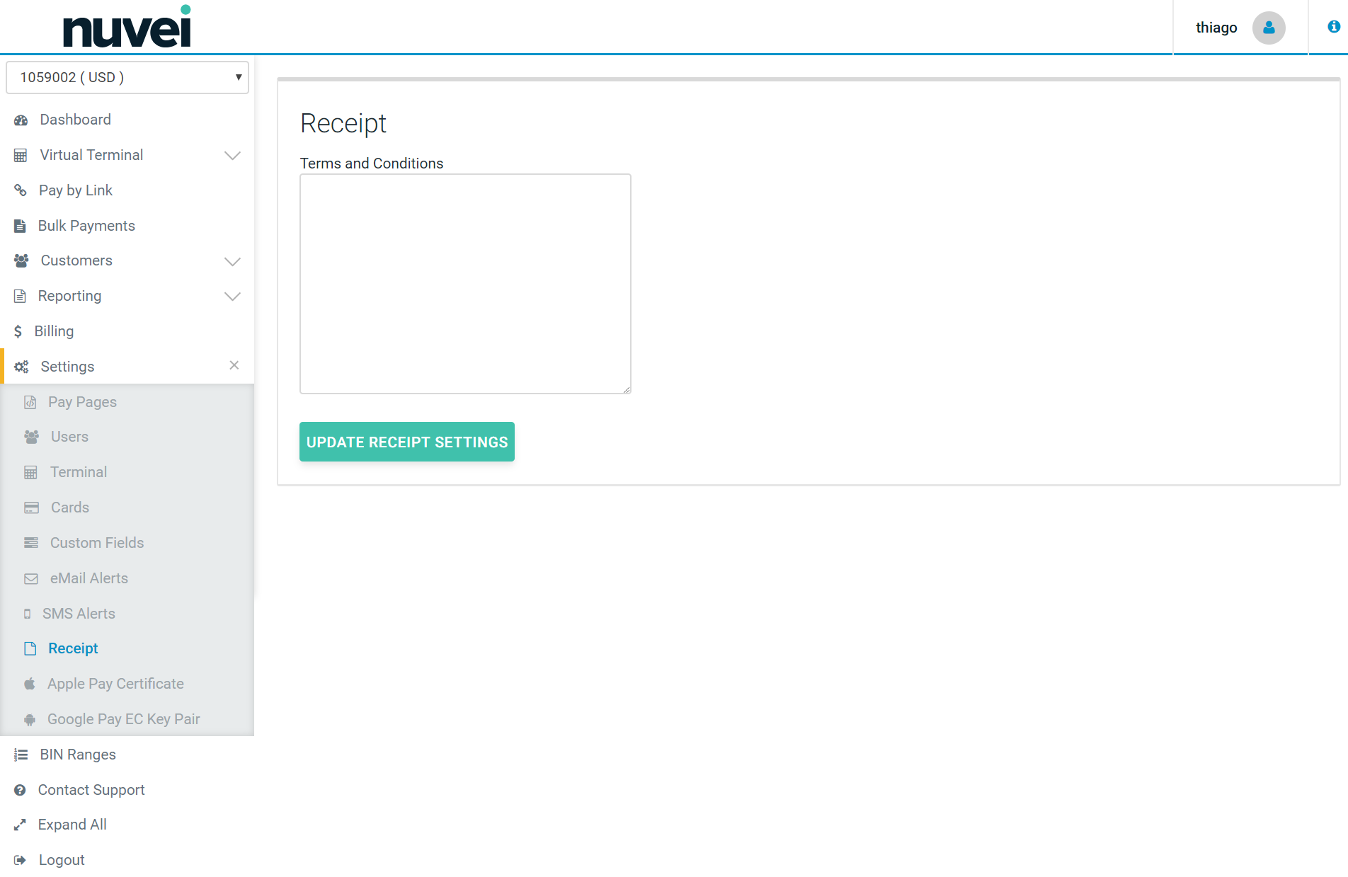 Select Receipt from the drop down box to add a receipt disclaimer (currently available for Virtual Terminal).